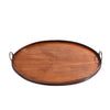 English oval serving tray in mahogany with a standing rim in alternating blocks of mahogany and satinwood. The tray is fitted with cast brass standing bail handles and centered on a satinwood sea shell inlay.