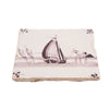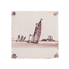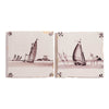 Two square mulberry faience tiles of sailing vessels along a shoreline.