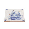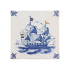 Delft tile of a galleon with the Dutch tricolor flags flying from the masts. The design is executed in cobalt underglaze blue with touches of brown and yellow. The corners are defined by spider scrollwork.
