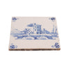 Pair of Delft faience tiles of buildings in a landscape with scrollwork spider designs in the corners.