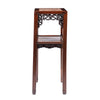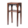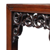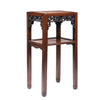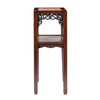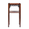 Pair of marble topped rectangular tea stands with finely carved and pierced aprons with shelf stretcher. The stands are of solid Asian rosewood, with a frame and panel construction on square legs terminating in a carved hoof foot. The tops are framed marble panels.