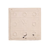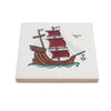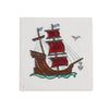 Square faience tile of a galleon under sail with raised outlines, colored in brown, red, green, and blue.