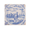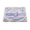 A rare Delft faience scenic narrative tile of a girl astride a farm animal directing a dog back to the farm. The scene is framed within an inscribed circle and the corners are defined by spider scroll work, delineated in cobalt under glaze blue. The back has been fitted with felt feet for use as a coaster or trivet.