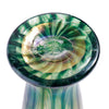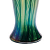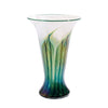 Hand blown art glass flared vase by Lundberg Glass Studios from the "Magnolia" series. The green & yellow leafy elements emerge from the bulbus foot to the flared rim on a white lattice ground.